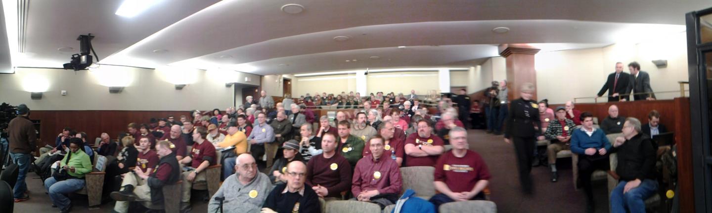 The maroon shirts of the pro-civil rights Gun Owners Civil Rights Alliance outnumber the antis by at least 20 to 1 in this photo (courtesy of GOCRA), and they did at every single committee hearing.