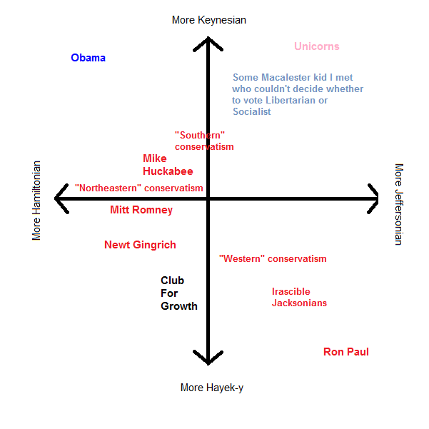 And both Hamilton and Jefferson appear both to the right and left of center; “Progressive” Hamiltonians are behind everything from the New Deal to, well, everything Obama has done. Conservative Hamiltonians – think “Northeastern Conservatives” – believe in federal power, if not necessarily the bureaucracy to feed off that power (for example, the conservative case for the healthcare individual mandate). Southern Conservatives? They’re a lot more Hamiltonian than you might think; it was federal power that brought the South into the 20th and 21st centuries. Western conservatives are Jeffersonian, to a degree – except, in many cases, on defense.