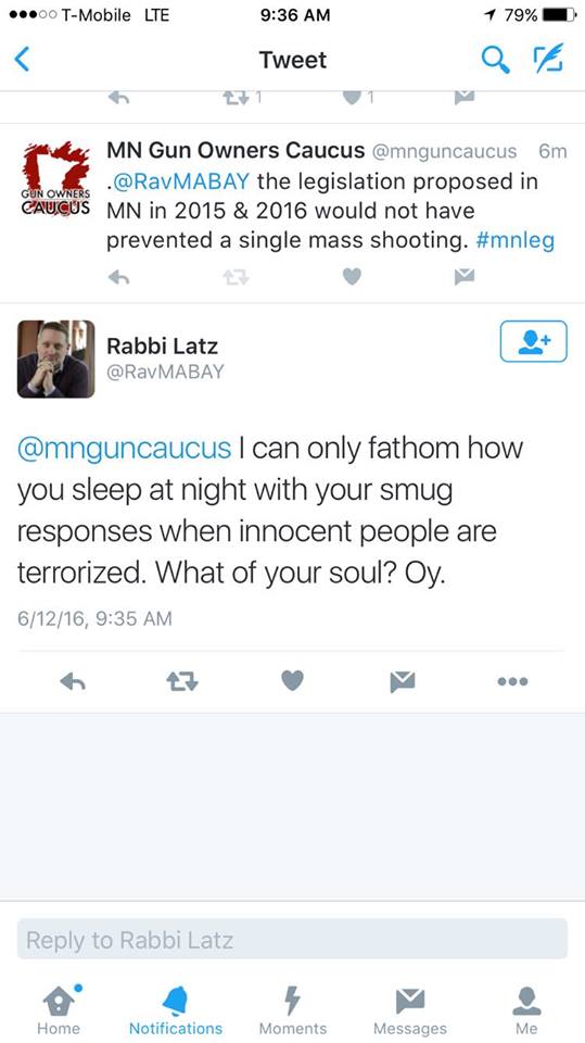 That Latz, rabbi at a “progressive” congregation in Saint Louis Park (who was in the process of dislocating his spine while bending over backwards to pin this atrocity on gun owners, rather than an ISIS terrorist) is in mid “smug response” with this tweet is the sort of inevitability that you learn to accept when dealing with orcs and the gun issue.