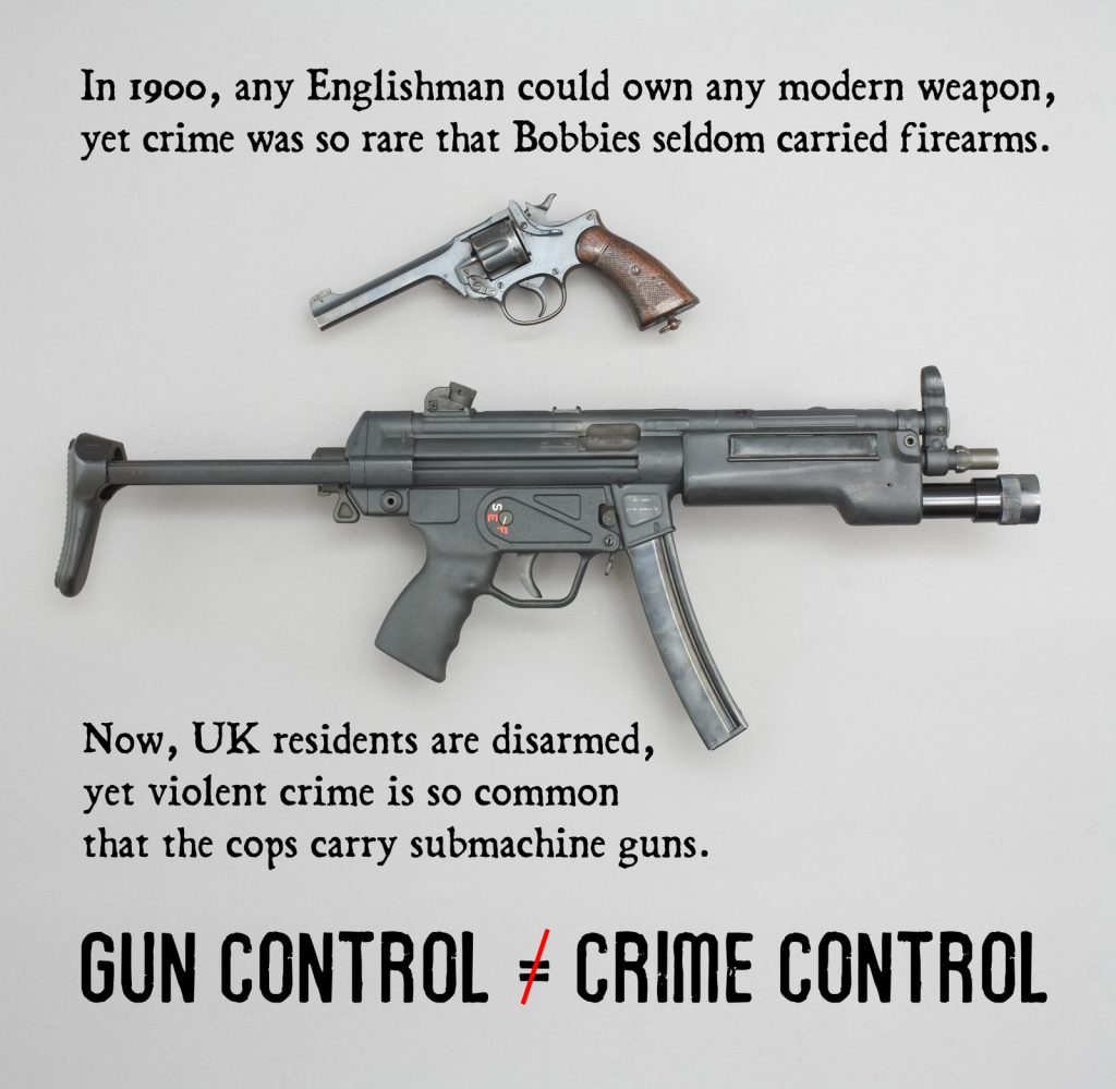 It’s a lie on so many levels. In 1900 an Englishman could buy an arsenal from a hardware store, no questions asked. A little later in the 20th century he had to purchase a gun permit, but it was a tax thing. You bought your permit at the post office. Serious gun control didn’t start in England until after World War One.
