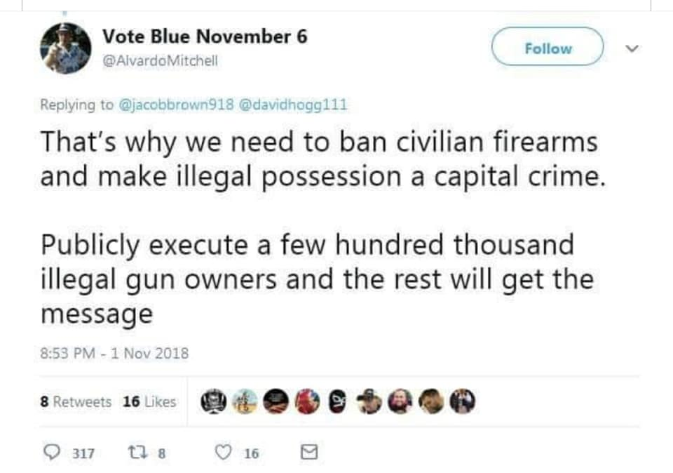This entry was posted by by Mitch Berg on Monday, November 5th, 2018 at 5:45 am and is filed under Democrat Party, Victim Disarmament. You can follow any responses to this entry through the RSS 2.0 feed. You can leave a response, or trackback from your own site.