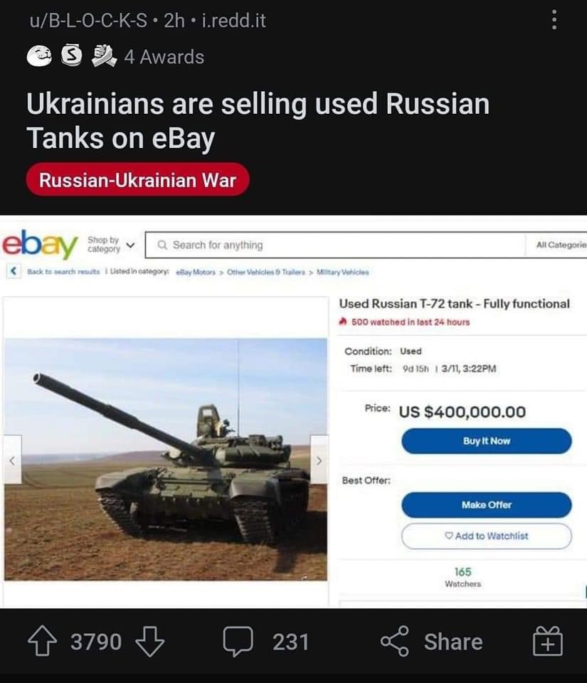 Good question. All of the left wing bobble heads touted the disparity of tanks/armored vehicles between Russia and Ukraine. I wonder if some enterprising Ukrainian will set up a web site to sell those tanks, i.e. Tankgurus or Tankvana?