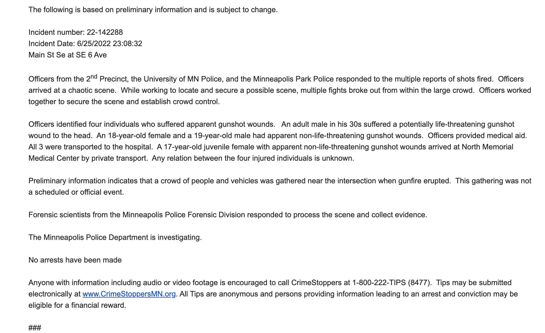 Four shot last night, right around downtown Minneapolis‘s casual tourist epicenter, the Stone Arch Bridge.