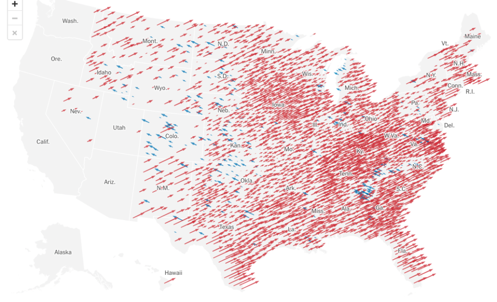 It’s live and interactive here – and it’s an interesting read. Each red arrow is a county where the vote was more Republican than it was in 2020. Note that many of the blue arrows in red states – I’m looking at you, Oliver County North Dakota – are counties where the GOP vote dropped from the 90s into the 80s, for example.
