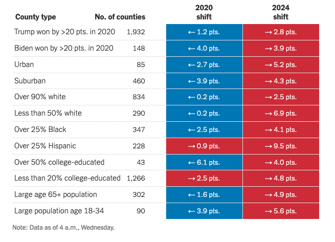 The New York Times released a “shift map” of election result shifts, by county.