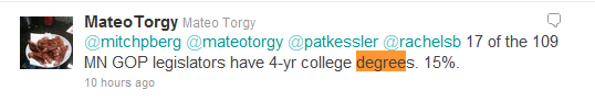 The Mister O’Brien 2+2=5 Award For Analysis – This one goes to Minnesota Progressive Project’s Eric Pusey who, in the middle of complaining that nobody was covering the dreary, addled “Netroots Nation” and all the media were over at the companian, interesting, hospitable, babe-packed “Right Online” conference, noted for his blog’s brief national audience that the Strib is really a conservative tool.