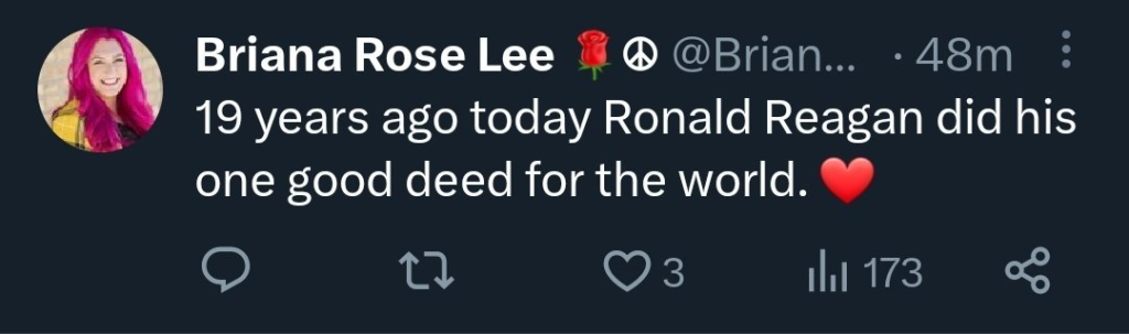 Readers here might be surprised to learn that Ms. Lee owns three cats and supported Bernie Sanders for President. Of course she hates Reagan, because Reagan ended (or at least temporarily suppressed) Russian Communism.