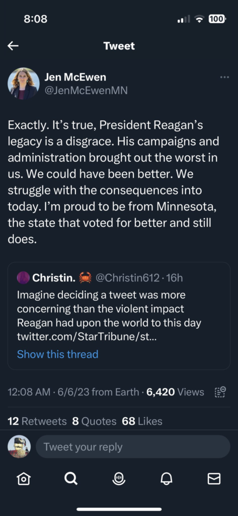 But in a statement, DFL Chair Ken Martin said her tweet about Reagan did not “reflect the values of the DFL Party.”