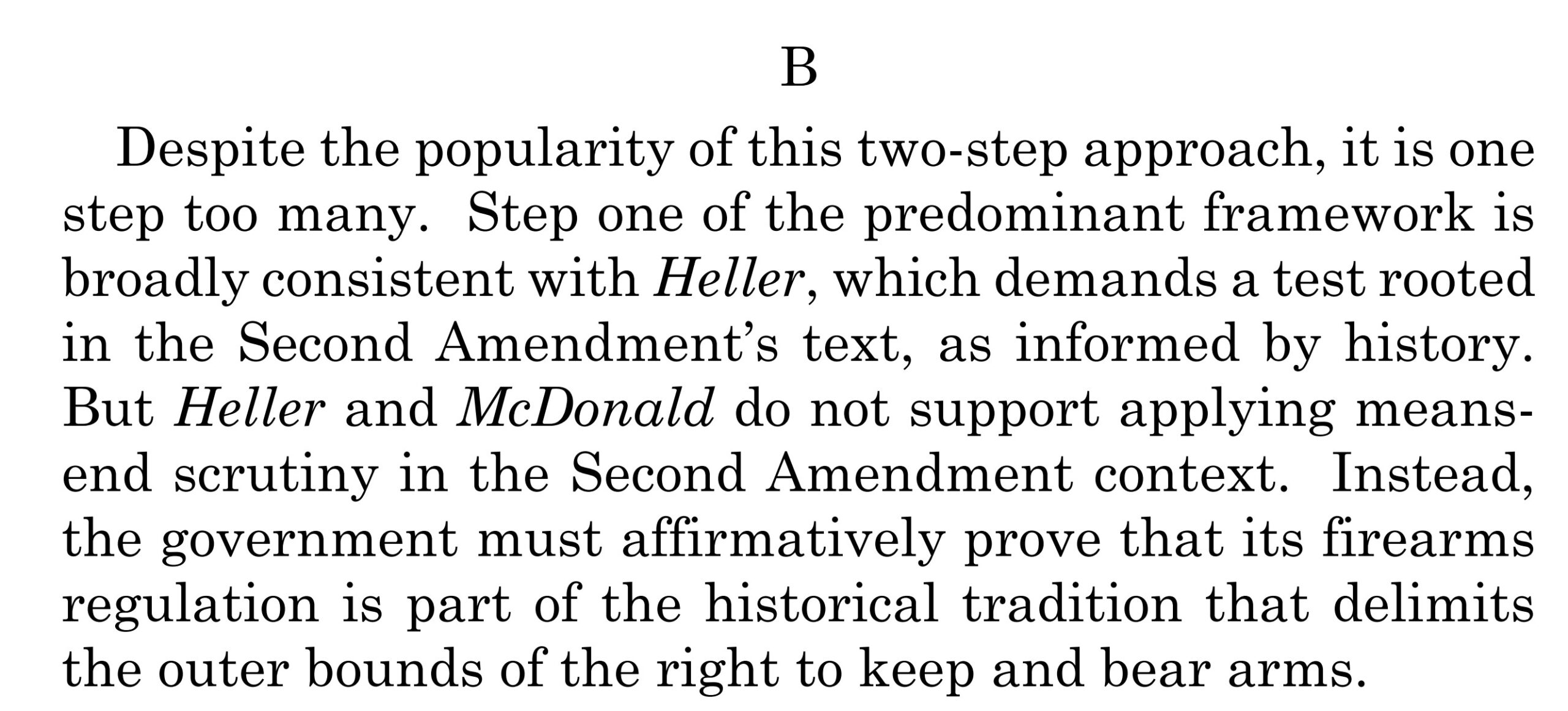 This decision specifically rejects the watered-down versions but does not specifically embrace the strictest standard. I speculate someone in the majority was a weak sister unwilling to make the hard decision (looking at you, Mister It’s Not A Tax But If It Were Then Obamacare Would Be Constitutional So Call It Good). Instead, Justice Thomas invented a new standard specifically for gun cases which requires a historical analysis to determine which regulations survive.